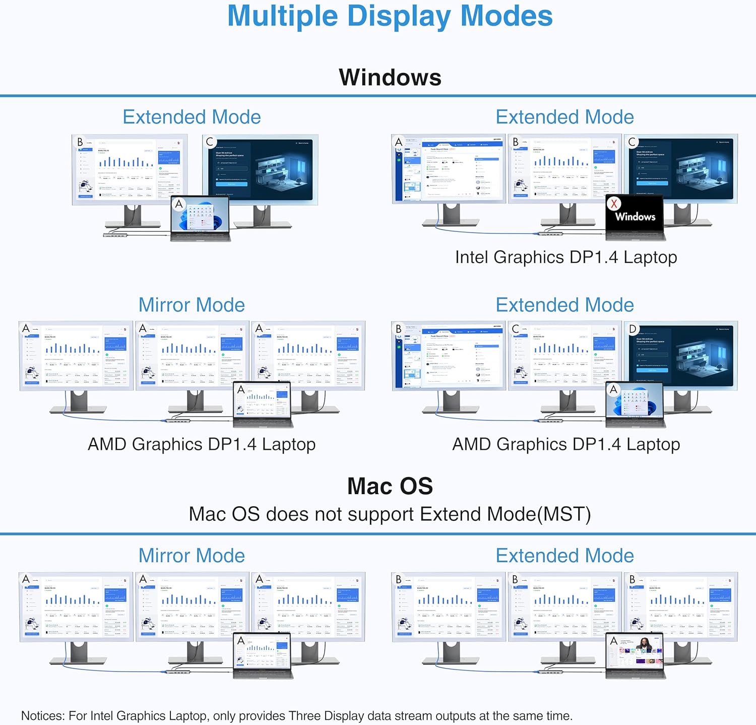 【USB-C Docking Station 8 IN 1】❤❤NOTE!!! Before you purchase, please ensure the USB-C port of your laptop support video output or DP Alt Mode, which decides the HDMI & DP & VGA port work or not. The dual HDMI USB C Hub expands your work opportunities, convert your usb c port into 2 HDMI,1 Displayport,1 VGA,3 USB 2.0 ports and 1 USB C PD charging port. No need any drivers or software, just plug and play.❤For Win System Laptops, this usb c docking station dual monitor support both SST and MST mode. 【USB C Hub Multiport Adapter with Quad Displays】The Laptop Docking Station with 4 video output ports: 2 HDMI+DP+VGA, can easily to achieve dual monitor/triple monitor/quad monitor displays for Windows OS. Mirror or extend your screen with the USB-C dongle's HDMI port and directly stream 4K UHD video to HDTV,monitors,or projectors for a cinema-like visual feast,using different monitors to do different projects will make your work/life more efficient, perfect for office meetings and work at home. 【High Resolution 4k Output】HDMI1 & DP max up to 4K@60Hz, HDMI2 up to 4K@30Hz(work separately while source is DP1.4). When dual displays, HDMI1 or DP will be 4K@60Hz and HDMI2 up to 4K@59Hz(DP1.4). When using 2hdmi+DP, HDMI1 up to 4K@59Hz, DP up to 4K@29Hz, HDMI2 up to 2K@60Hz(DP1.4). Display output will be 1080P when multiple display with VGA. ★Note: When using 2hdmi+dp, must follow the sequence or it will fail: Plug in HDMI1→Plug in DP(wait for the screen to display successfully)→Plug in HDMI2. 【100W Power Delivery 3.0 Technology】Docking station for hp laptop is rated at 87W and support power delivery 3.0 technology which allows charging your laptop while connected to multiple devices and shortened charging time. In addition, the 3 USB 2.0 port in dell docking station 3 monitors provides data transfer speed up to 480Mbps, perfect for mouse, keyboard or other low rate devices. Reminder: Please supply power for your laptop by PD3.0 charging port before connect with an external device.