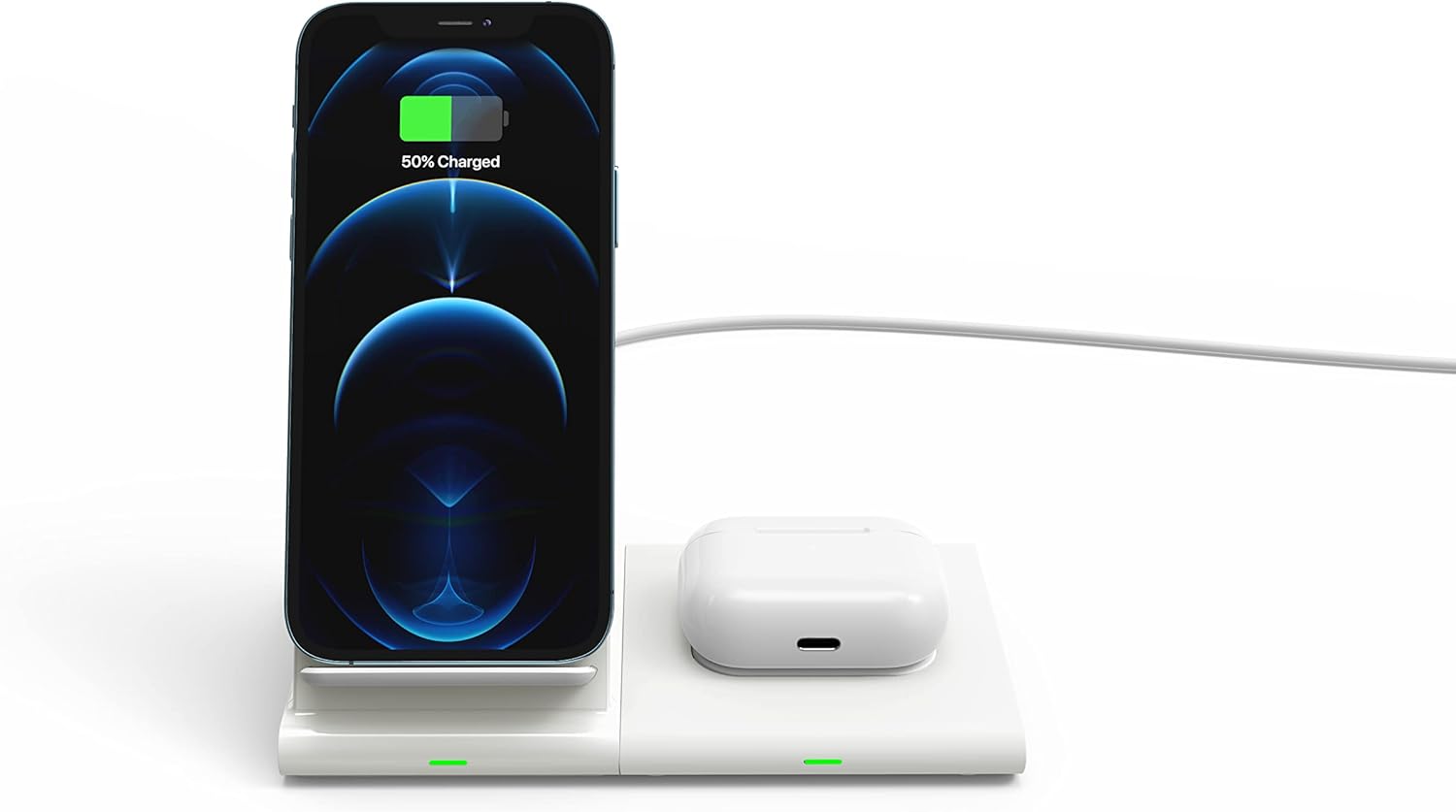 ADAM elements 2in1 Wireless Charger, Omnia Q2x 2-in-1 Wireless Charging Station for iPhone 8 to 14 Series, AirPods Gen 2 & AirPods Pro, Android Phones (Qi-Certified) (White)