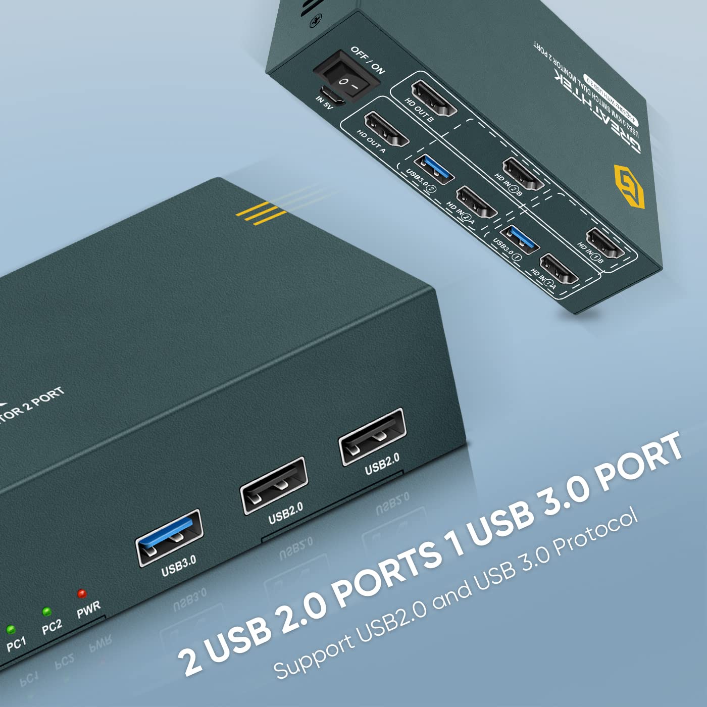 USB 3.0 HDMI KVM Switch Dual Monitor 2 Port,KVM Switch 2 Monitors 2 Computers 4K@60Hz,USB 3.0,Dual Monitor KVM Switch with HDMI2.0,HDCP2.2, KVM Switch with 4 HDMI and 2 USB Cables,Button Switch USB3.0