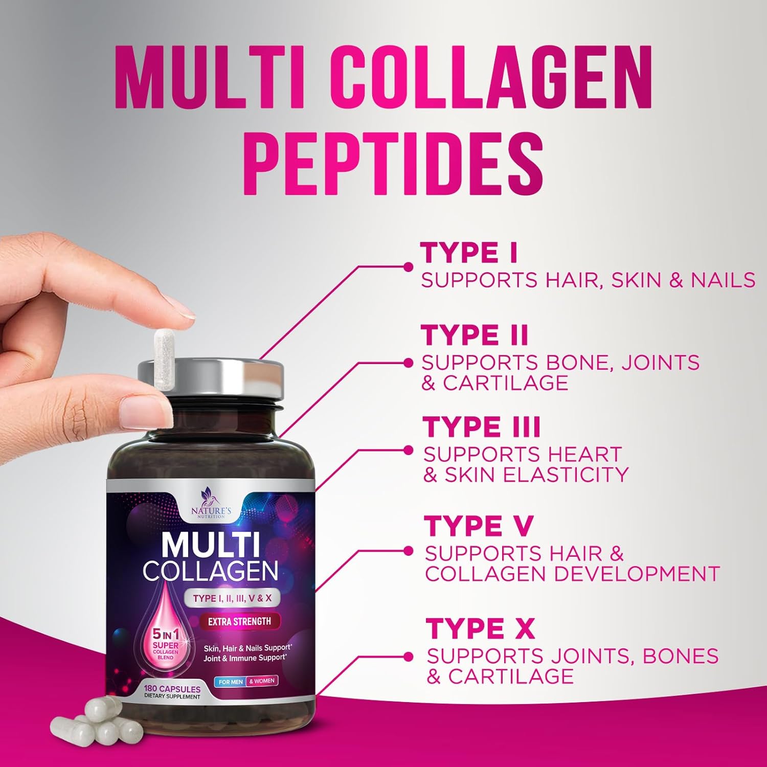Multi Collagen Complex - Type I, II, III, V, X, Grass Fed & Non-GMO Hydrolyzed Collagen Peptides Supplement - Supports Hair, Nail, Skin, Bone and Joint Health, Gluten-Free, Paleo & Keto - 180 Capsules 180 Count (Pack of 1)