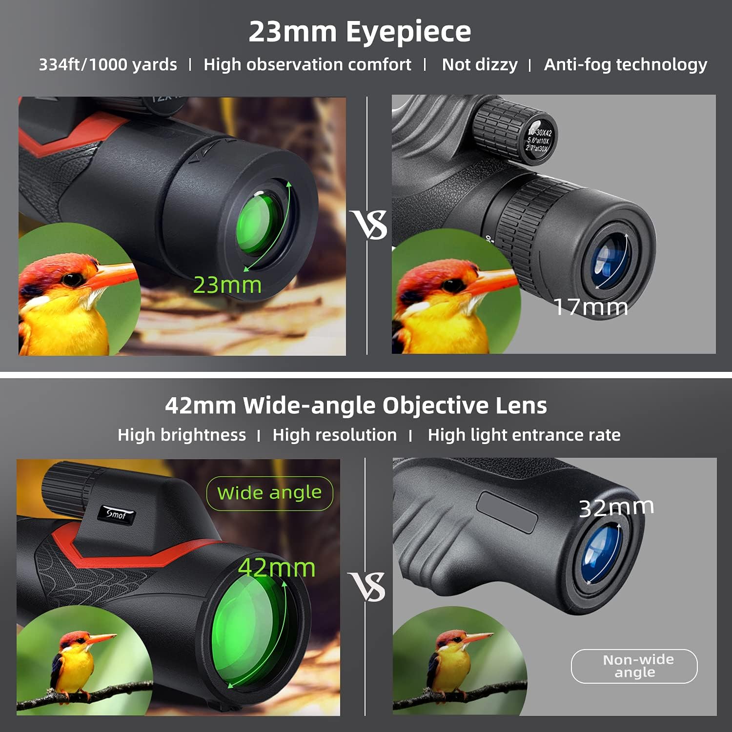 【Wide-angle + Excellent Field of View】 Smof ITO-1 wide-angle, high-definition monocular is a high-power monocular that provides 12X magnification with a 42mm objective diameter of its wide lens. It offers an impressively large field of view at 334 feet per 1000 yards. The diameter of the objective lens allows for lots of light to enter and flawless function in low light conditions as well. This is definitely a perfect choice for bird watchers, hunters or Nature lovers. 【Bak-4 Prisms + FMC Green Lens Coating】 The Smof ITO-1 uses a large Bak-4 Prism (Boosts a high light transmittance reaching up to 99.9%) internally and a (FMC)fully multi-coated green anti-fog coating for its lens. You’ll get bright, clean and sharp image in all your viewing. 【Central Focus Adjustments】 There’s a focus ring that helps you to easily and rapidly focus with one hand; The focus wheel is large and ergonomically designed for greater comfort when using. 【Comfortable Rotatable Eyecups】 The eyecups are adjustable and can be quickly rotated either up or down to allow for comfortable viewing whether you’re wearing eyeglasses or not. You will be able to identify your target easily and you’ll feel like you’re standing right in front of it.