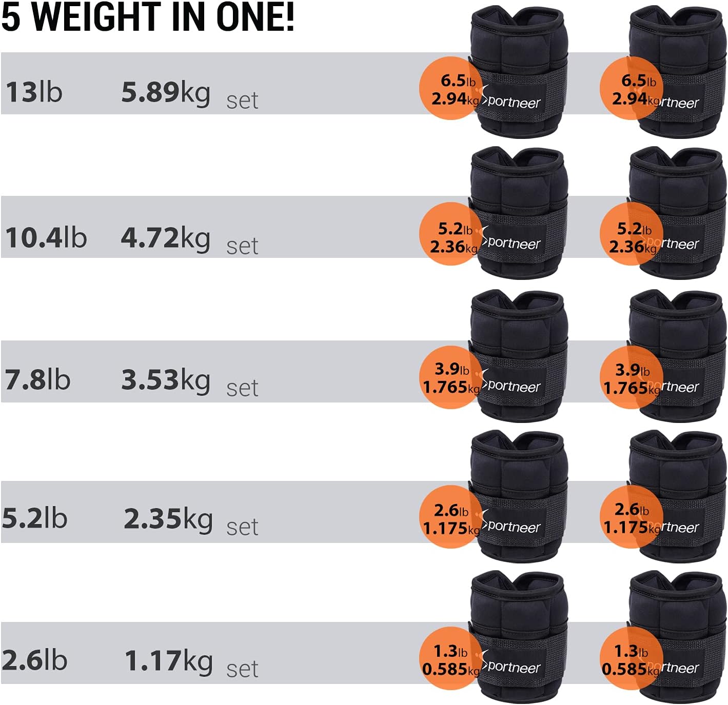 ADJUSTABLE ANKLE WEIGHTS: The Sportneer ankle weights come in pairs; each single weight comes with 5 removable sandbags, which weigh 1.3 LB. Each single weight can be adjusted from 1.4 lbs to 6.5 lbs, and one pair can be adjusted from 2.8 lbs to 13 lbs by adding or removing the sandbags. Durable Weights For Men & Women: The weighted ankle weights are available for core training and faster recovery for different body types. 13 lbs adjustable ankle weights offer heavier weights for those with higher demands for daily training. Quality & Comfort: The adjustable ankle weights are made of a neoprene exterior and filled with high-quality iron sand to ensure a compact profile. Reinforced stitching and sturdy outer trim, which will give you maximum comfort during workouts. Extended Length & Strong Velcro: The adjustable leg weights are designed with extended length velcro (about 14.5 inches), which can ensure a long enough fit and provide a greater fit for sizes of ankle from 8 to 13 inches (perimeter).