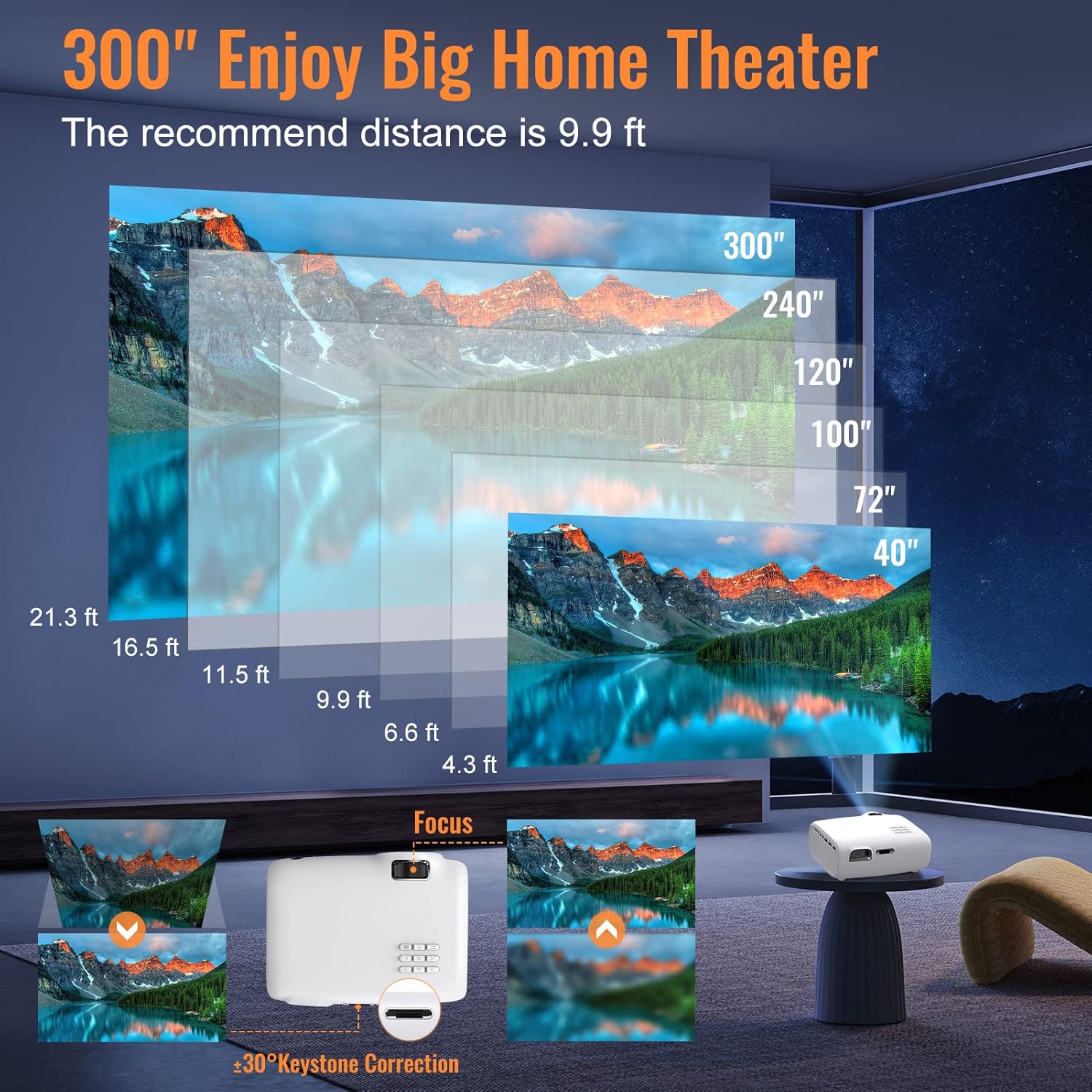 Ultimate Picture Quality: Featuring native 1080P HD resolution, 9800 lumens of brightness, and 10,000:1 dynamic contrast, this projector delivers ultra-sharp images and vibrant colors for a truly immersive audio-visual experience. Convenient Connectivity: The built-in WiFi and Bluetooth 5.1 chip allow for easy and quick synchronization with your phone or other devices, while Bluetooth compatibility lets you connect external speakers for a better sound experience. Giant Screen Experience: Project up to a massive 300" screen, with the ability to adjust the image size using the remote control. Perfect for movie nights, outdoor events, or indoor entertainment. Multiple Device Compatibility: With 2 HDMI ports, USB, VGA, and AV ports, this portable projector can easily connect to your TV, smartphone, tablet, laptop, and more.