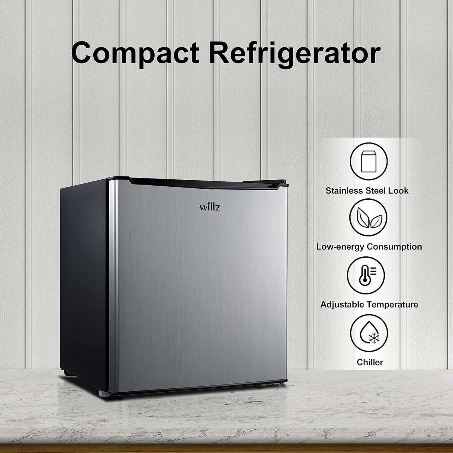 Willz WLR17S5 Compact Refrigerator, 1.7 Cu.Ft Single Door Fridge, Adjustable Mechanical Thermostat with Chiller, 1 Coated Wire Slide-Out Shelf, 1 Power Cord, Stainless Steel Look
